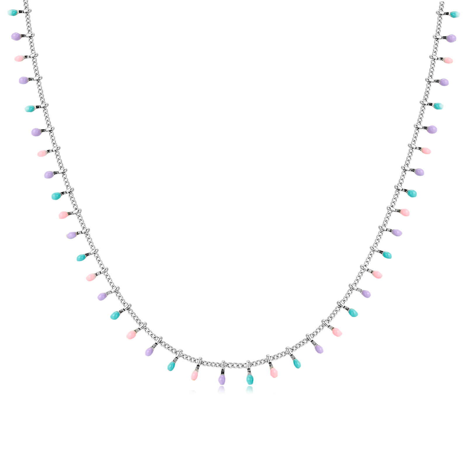 Descubre nuestro collar decorado con pequeños bastones de colores sutiles en sus puntas, fabricado en acero inoxidable de alta calidad (316L).