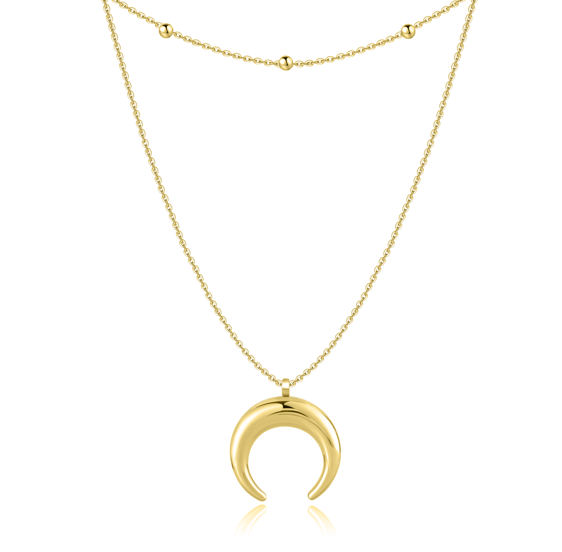 Descubre nuestro exclusivo collar, formado por dos cadenas: una adornada con pequeños puntos y la otra con una elegante luna. Fabricado en acero inoxidable quirúrgico (316L) de la mejor calidad, este collar es tanto duradero como deslumbrante.