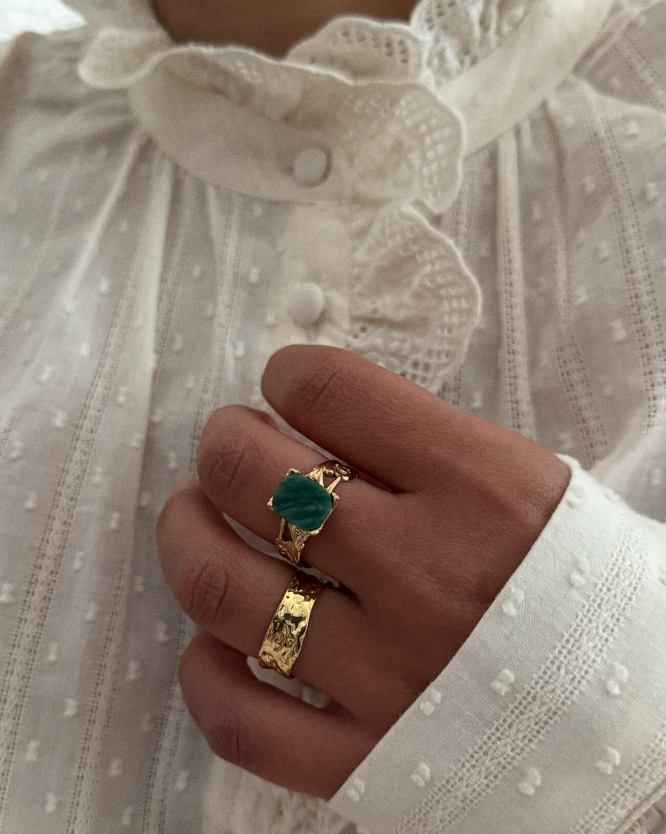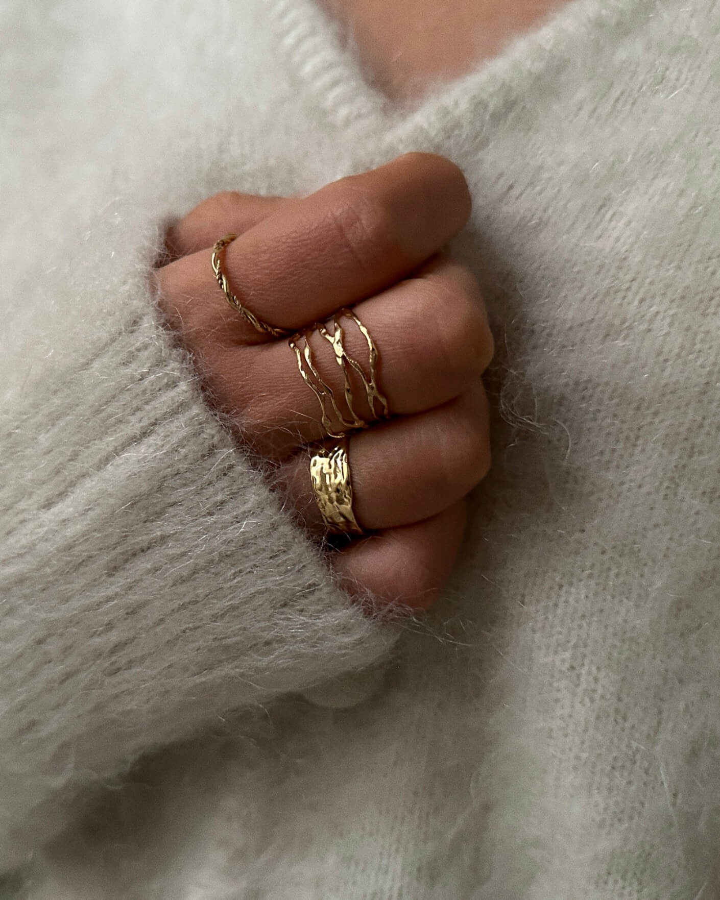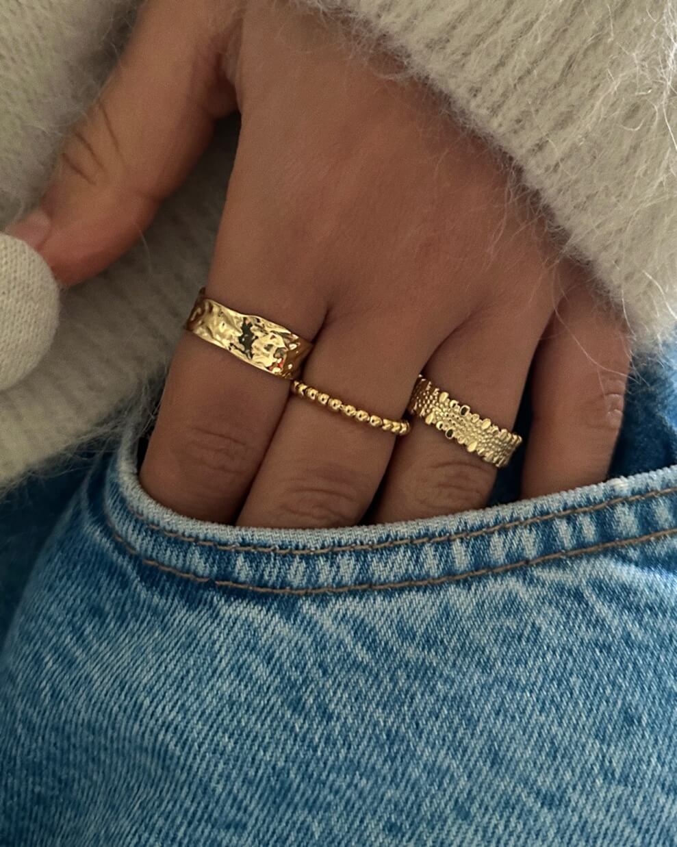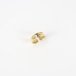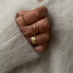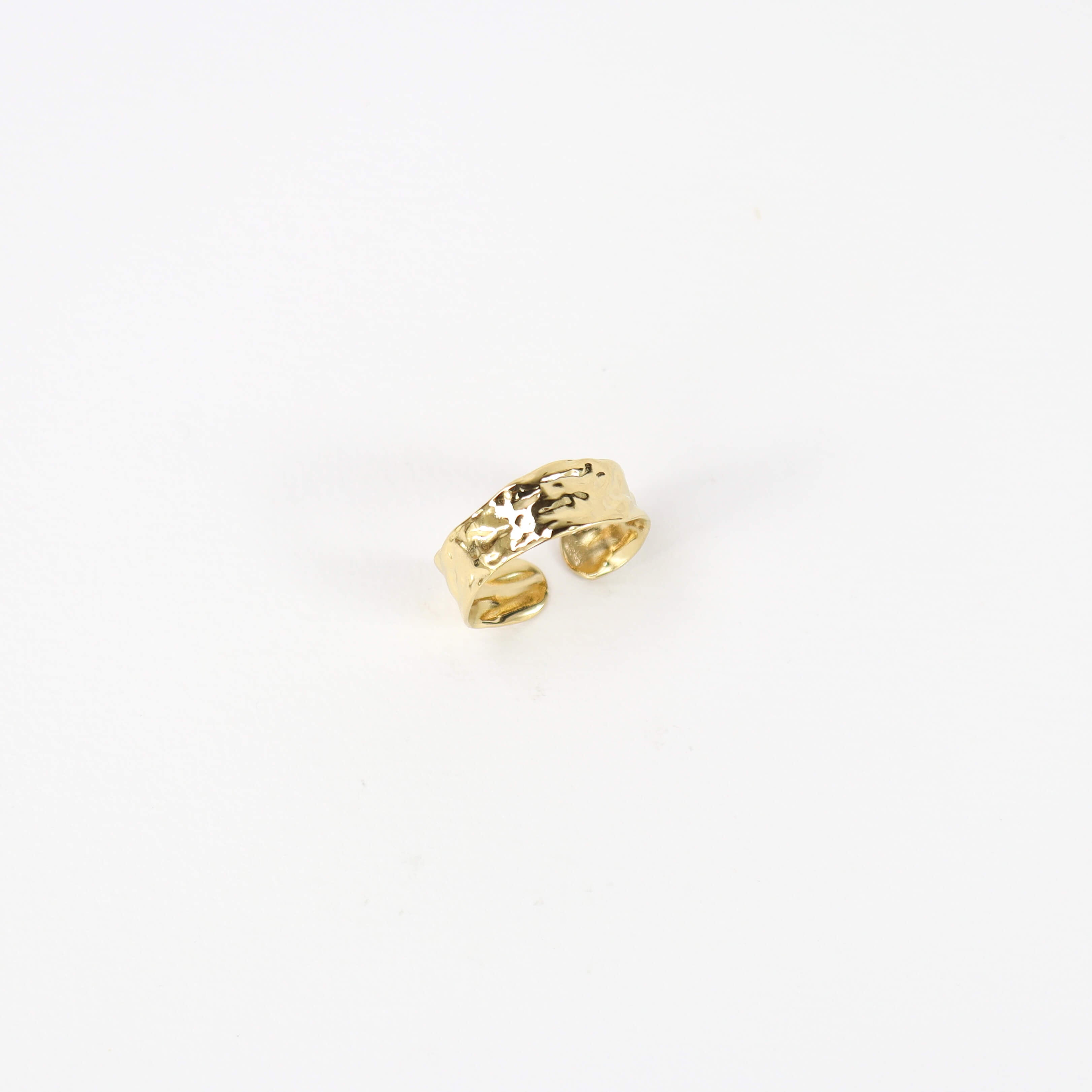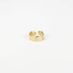 Descubre la elegancia de nuestro anillo dorado con un sofisticado detalle martillado. Diseñado para ajustarse a todos los tamaños de dedos, este anillo es perfecto para cualquier ocasión.