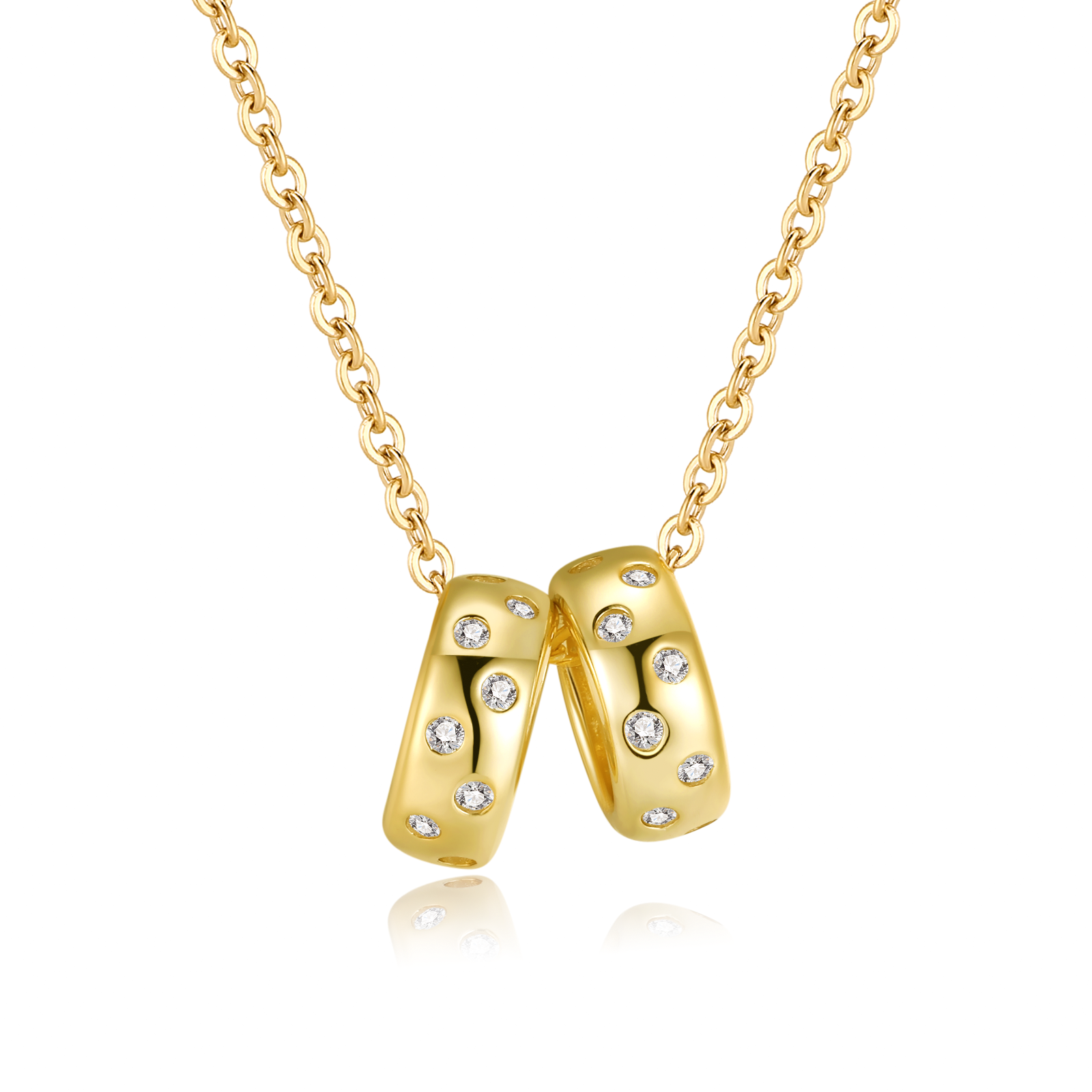 Descubre la elegancia de nuestro collar con doble aro, adornado con circonios blancos que brillan con cada movimiento. Fabricado en plata esterlina (925), este collar cuenta con un lujoso baño de oro de 18K que le añade un toque sofisticado.