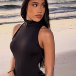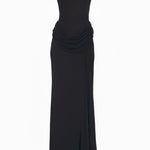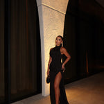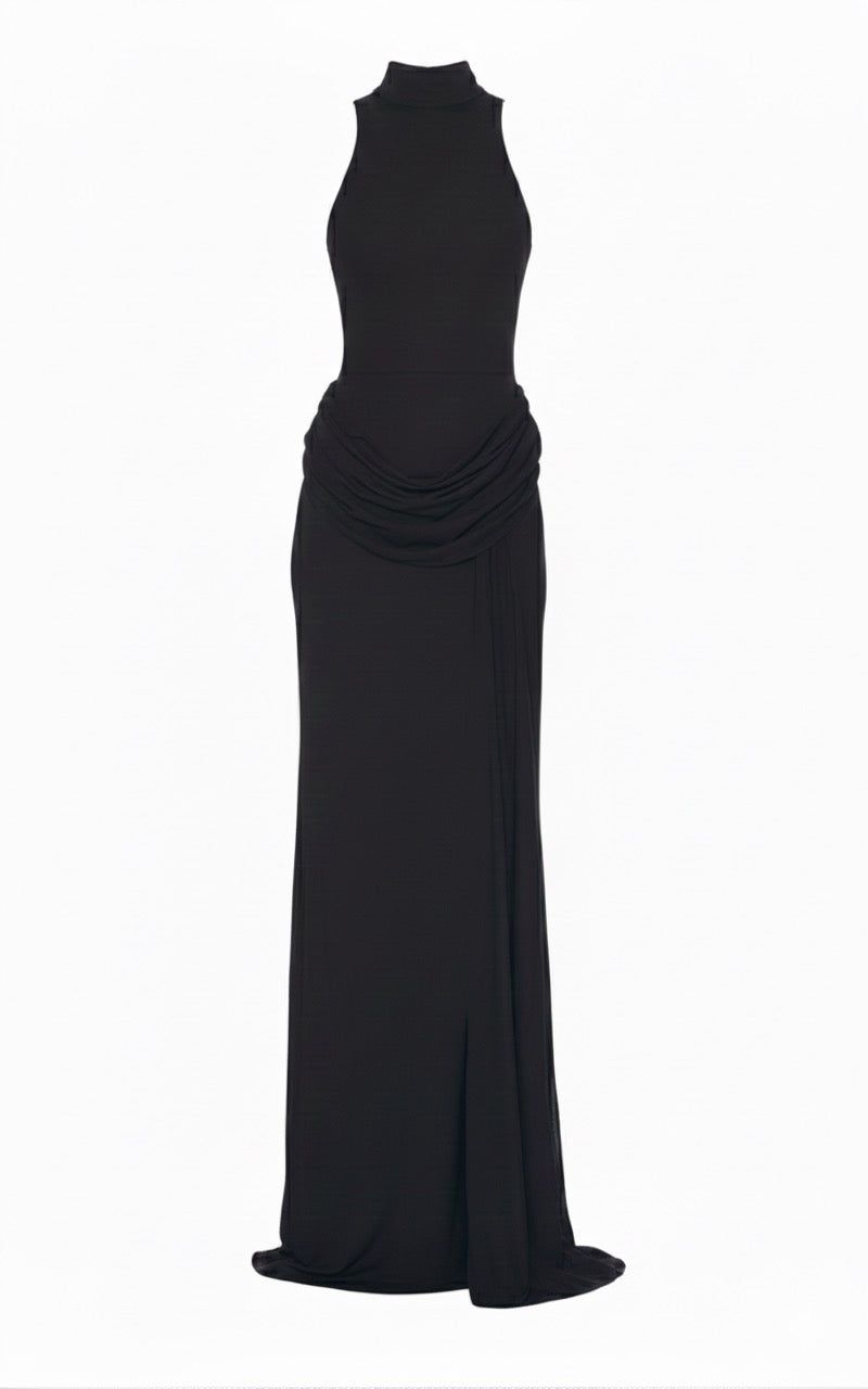 Este vestido largo negro de cuello alto, que destila un lujo discreto, es un ejemplo de elegancia moderna. Diseñado con una silueta refinada sin mangas, se adapta suavemente al cuerpo, mientras que la cintura drapeada crea un efecto favorecedor y esculpido. La falda fluida, que llega hasta el suelo, se mueve con gracia y naturalidad, ofreciendo un look potente y femenino a la vez.