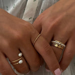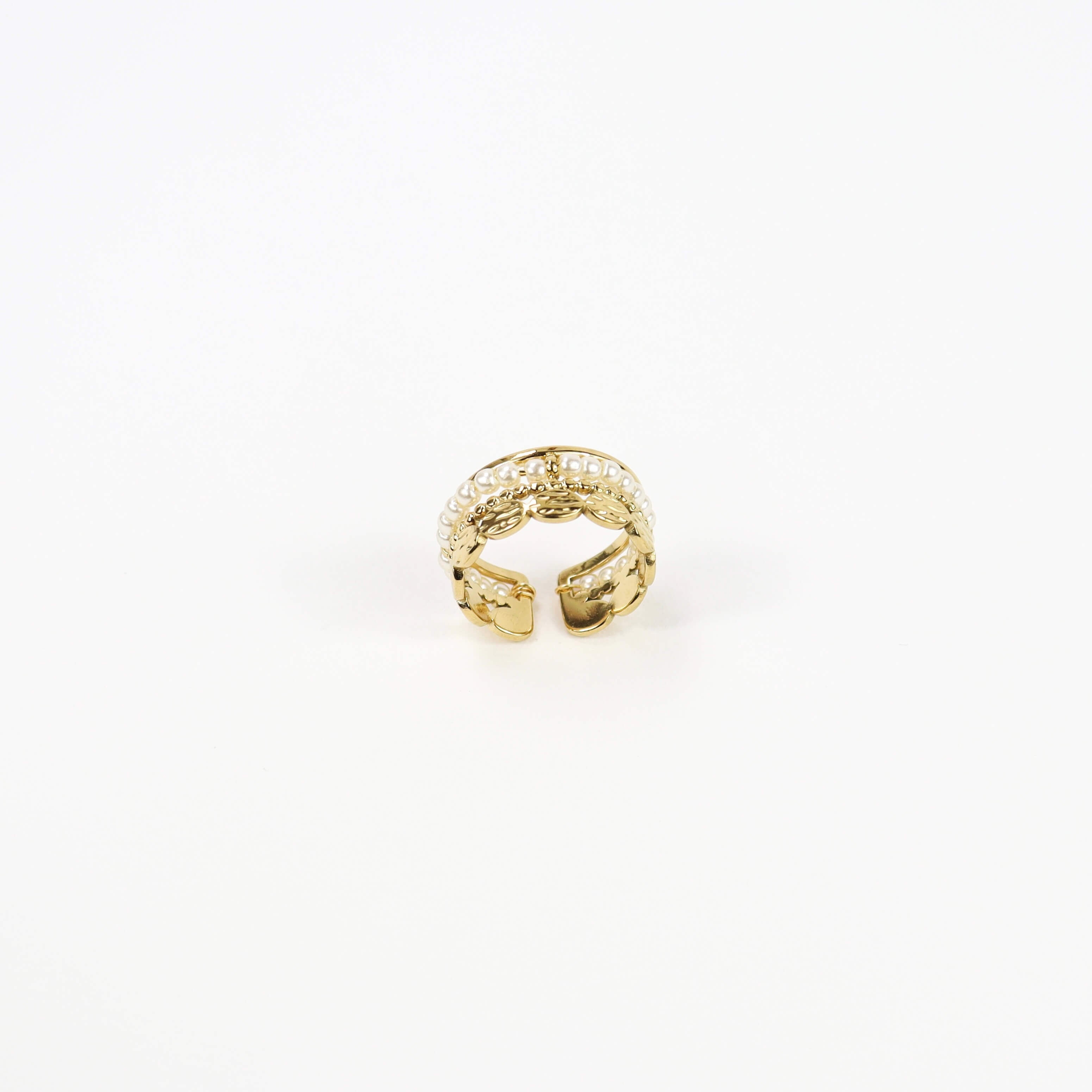 Anillo con detalle de tira de nácar que combina elegancia y versatilidad.